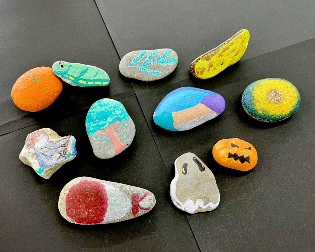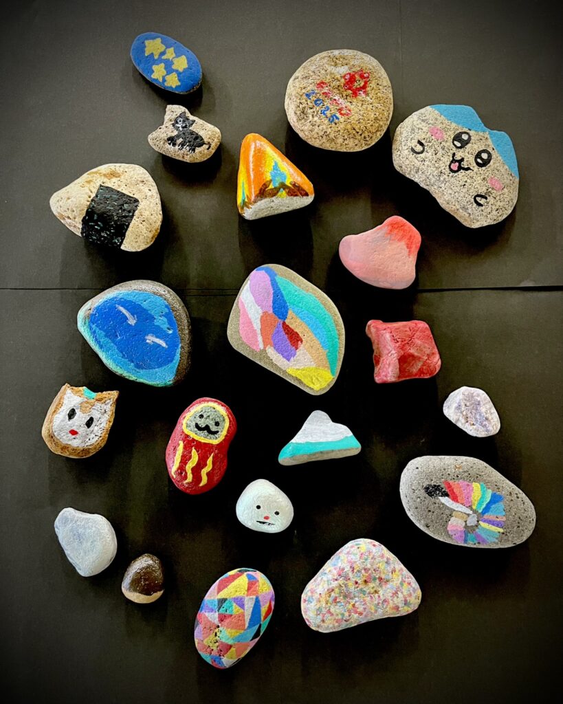 絵の具やペンなどを使って好きな絵を描いたり、石の形を生かしたデザインにしたりと表現は様々です。